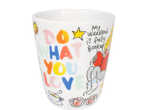 Slow down, shake it off & Lazy days. Met deze vrolijke alledaagse dingen en herkenbare situaties in een kleurrijk jasje geef je jezelf of een ander een BIG HUG! Deze DO WHAT YOU LOVE beker staat helemaal in het teken van boeken. Illustraties van boeken, een leesbril en teksten zoals; ‘My weekend is fully booked’ zijn te vinden op deze beker. Schenk wat lekkers in en geniet van je favoriete boek! Je kan een naam of persoonlijke tekst door ons atelier op de beker laten zetten. De tekst wordt op het handvat gezet, zie ook bijgaand voorbeeld. Personaliseren is handwerk, hierdoor kan het handschrift afwijken van het voorbeeld. Materiaal: aardewerk Hoogte: 11 cm Diameter: 9 cm Inhoud: 0,35
